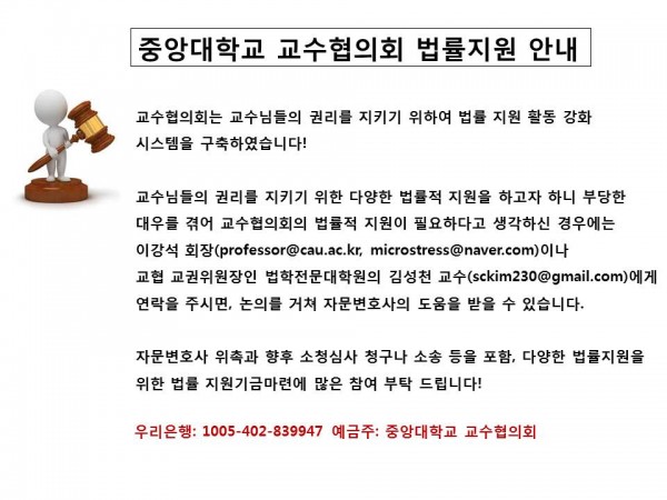 앞으로 교수님들께서 부당한 대우를 겪어 교수협의회의 법률적 지원이 필요하다고 생각하신 경우에는 이강석 회장(professor@cau.ac.kr, microstress@naver.com)이나 교협 교권위원장인 법학전문대학원의 김성천 교수(sckim230@gmail.com)에게 연락을 주시면, 교수협의회의 논의를 거쳐서 교협 자문변호사의 도움을 받을 수 있도록 하겠습니다.