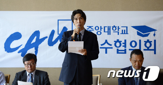(서울=뉴스1) 박지혜 기자 - 이강석 중앙대학교 교수협의회 회장이 13일 오전 서울 동작구 흑석동 중앙대학교 R&D센터에서 이용구 총장 불신임에 대한 찬반 투표 결과를 발표하고 있다. 중앙대 교수협의회는 "찬반 투표결과 투표 대상자 880명 중 514명이 찬성, 33명이 반대, 333명은 투표에 참여하지 않았다"고 밝혔다. 또 교협은 이 총장에 대해 “중앙대가 처한 위기를 극복하고 정상화되기 위해 책임자인 현 총장이 물러나야 한다”는 입장을 거듭 강조했다. 2015.7.13/뉴스1 pjh2580@